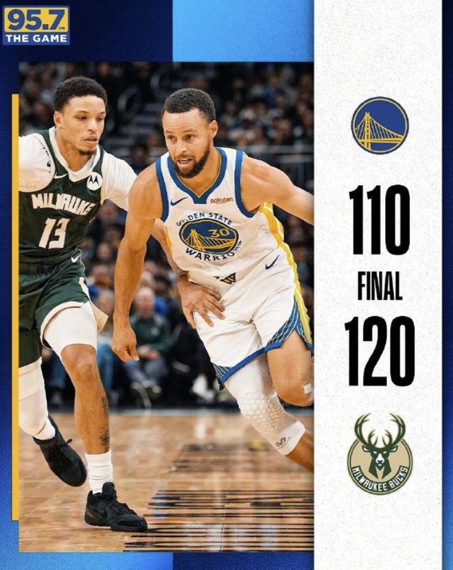 雄鹿八人上双120-110勇士,库里27分,罗林斯32+8,字母哥缺阵